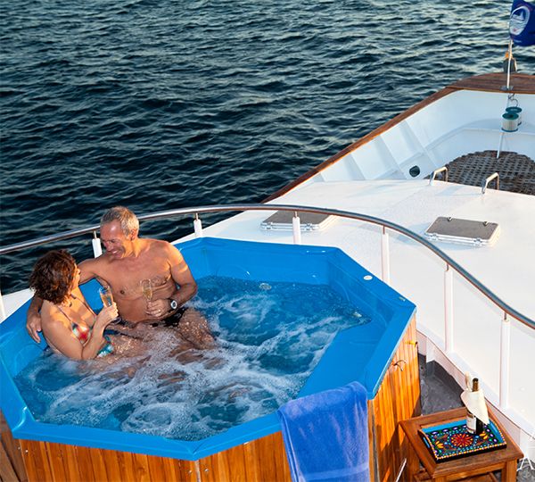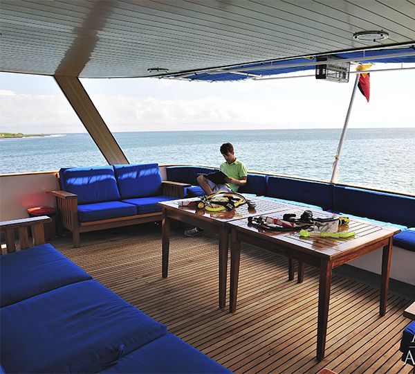 The Galapagos Aggressor III sleeps 16 guests in privacy and comfort. She has a beautiful spacious salon, large covered cocktail desk, chaise lounges and deck chairs, bar, grill, and hot tub. The Galapagos National Park does not allow drones.