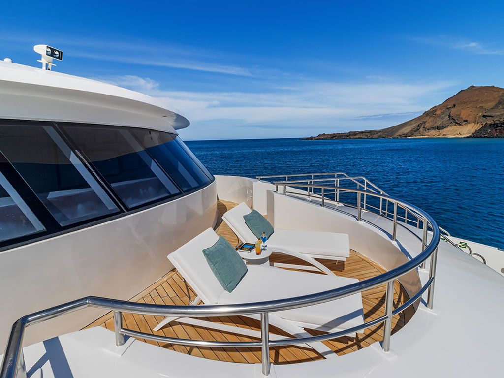 Watch the Galapagos Islands float by from the Sky Deck’s hot tub, bar and ample social areas for lounging, tanning or socializing.