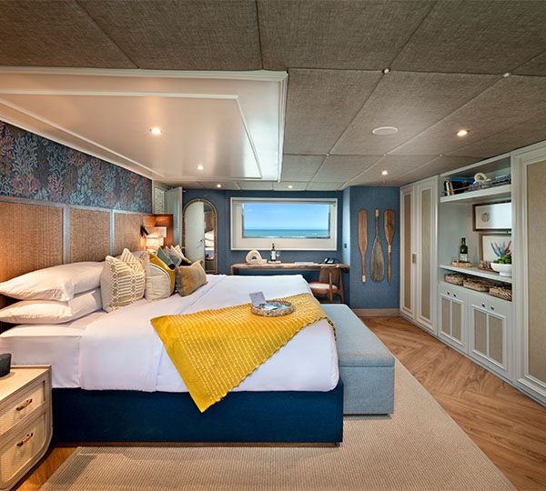On board the Galapagos Explorer, natural materials and rich textures celebrating local culture harmonise to create a warm and welcoming atmosphere, with wooden accents and neutral colours seen throughout. Panoramic floor-to-ceiling windows fill the spacious guest areas with natural light, providing breathtaking views of the ever-changing landscapes and wildlife wonders of the Galapagos. Indoor and outdoor dining and lounge areas ensure guests are spoilt for choice. While the yacht’s al fresco sundeck located on the uppermost deck boasts a decadent hot tub and comfortable lounge area ideal for whiling away the afternoon. Meticulously appointed air conditioned accommodation includes four beautiful cabins and two exquisite suites, featuring either portholes or windows. Ensuite bathrooms with luxurious showers and vanities complete the space.