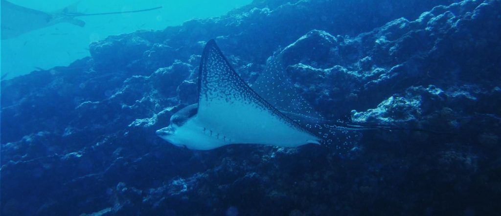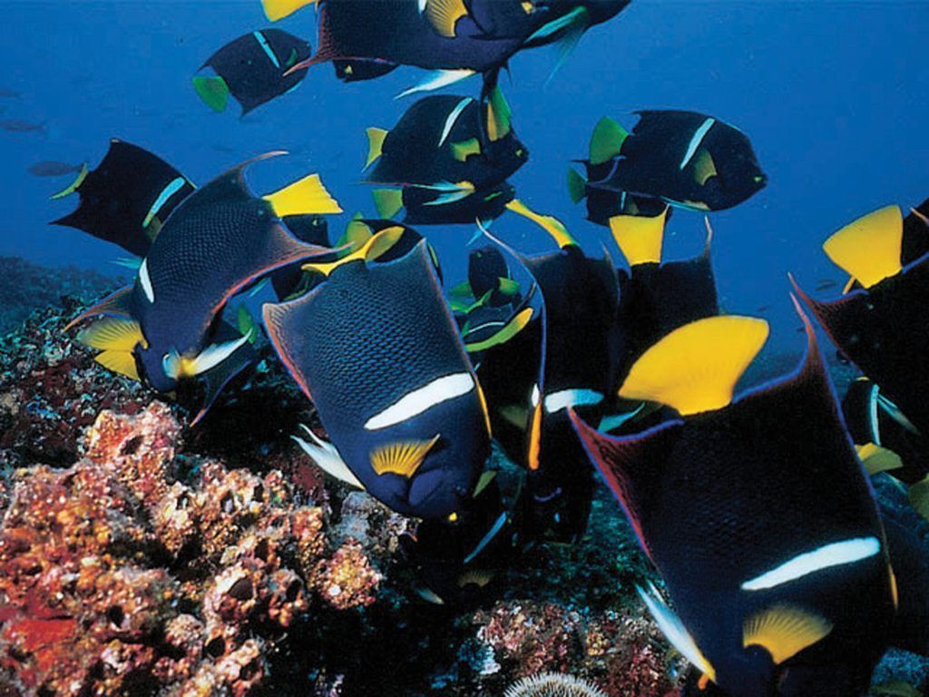 Подводный мир: белоперая акула, шипохвостые скаты, скаты-орляки, мраморные рыбы, рыбы-скорпионы, черепахи и морские львы; косяки рифовых рыб, таких как Помадазиевые.