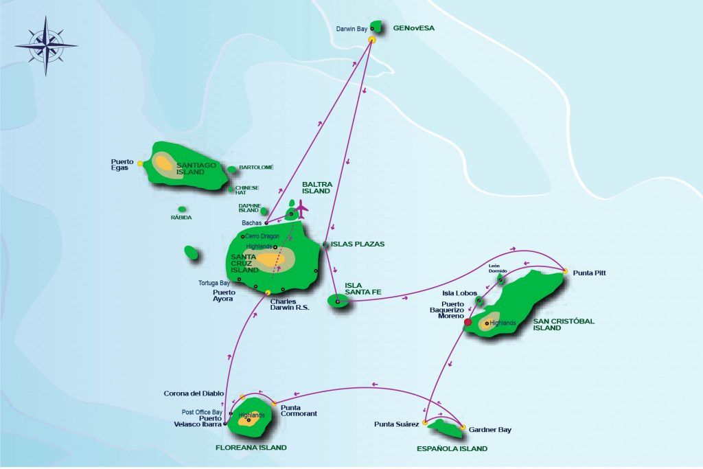 Our arrival to Plazas Islands will be at around 6 am after nighttime navigation. After breakfast, we start our first visit in the morning. Plazas are two small islets that were uplifted a short distance from the East Coast of Santa Cruz. The unusual vegetation and location of the island create an interesting landscape in which the fauna and flora of Galápagos are enhanced. Moreover, despite its small size, some of the most interesting and outstanding species of the archipelago occur here. It is possible to guarantee the observation of land iguanas that often are in the shade of a cactus. Nesting on the rugged southern cliffs, are usually swallow tailed gulls, along with various other sea birds. The protected rocky seashore is a prime habitat for a large colony of noisy sea lions. The main attractions of Plazas Island include the land iguanas, the sea lions and the swallow tailed gulls as well as yellow tailed mullets, Audubon’s shearwaters, red-billed tropicbirds, frigate birds, and brown pelicans gliding past the cliff. We return to the yacht for lunch and a well-deserved rest.