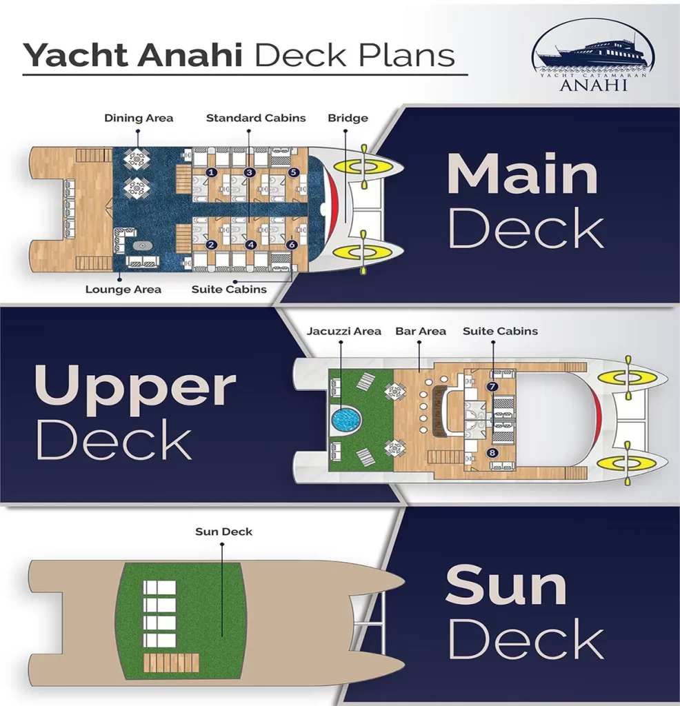 The M/C Anahi cruise is a Power Catamaran Yacht in the Galapagos Islands, built in Guayaquil, Ecuador, launched by the end of 2006 with high comfort standards. With unparalleled stability, your cruise is guaranteed to be a restful and relaxed one.