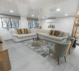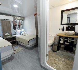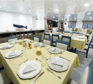 The accommodation for sixteen voyagers is distributed amongst six 14m2 twin cabins on the main deck (2 transformable to double bed), and two 25m2 SUITE CABINS on the upper deck. Every cabin includes large windows – portrait type – looking to the ocean, beautiful wooden floor and cozy private facilities with hot/cold water shower, besides to a locker, closet and air conditioning.