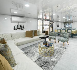 Additionally, on the main deck, the yacht offers ample resting areas, library, TV-DVD room, comfortable dining room and lounge. On the upper deck, the yacht features a charming bar and an excellent area for relaxation, together with a Jacuzzi for six people. On top of the bar area we find the ample sundeck with resting chairs for eight people.