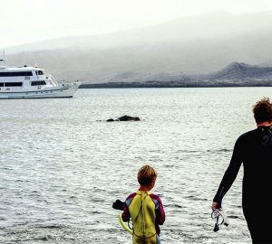 PORT EGAS: Wet landing on the dark sand beach of James Bay. 1½ hour hike on rocky terrain onto the Salt Crater were you can find Darwin finches, Galapagos hawks, marine iguanas, sally crabs, seals and sea lions. Snorkeling on the beach before heading back onboard.