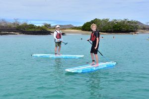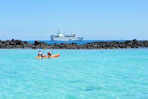 In the afternoon, we set down at this beautiful, white coral beach for a short walk to observe the sea lions, mockingbirds, finches, or enjoy the beach. There is great snorkelling in this area, or else there’s time to kayak or ride the glass-bottom boat.
