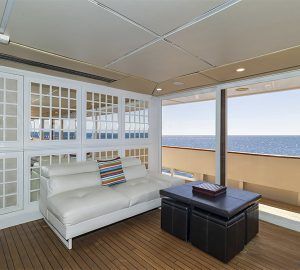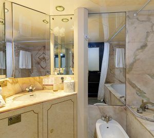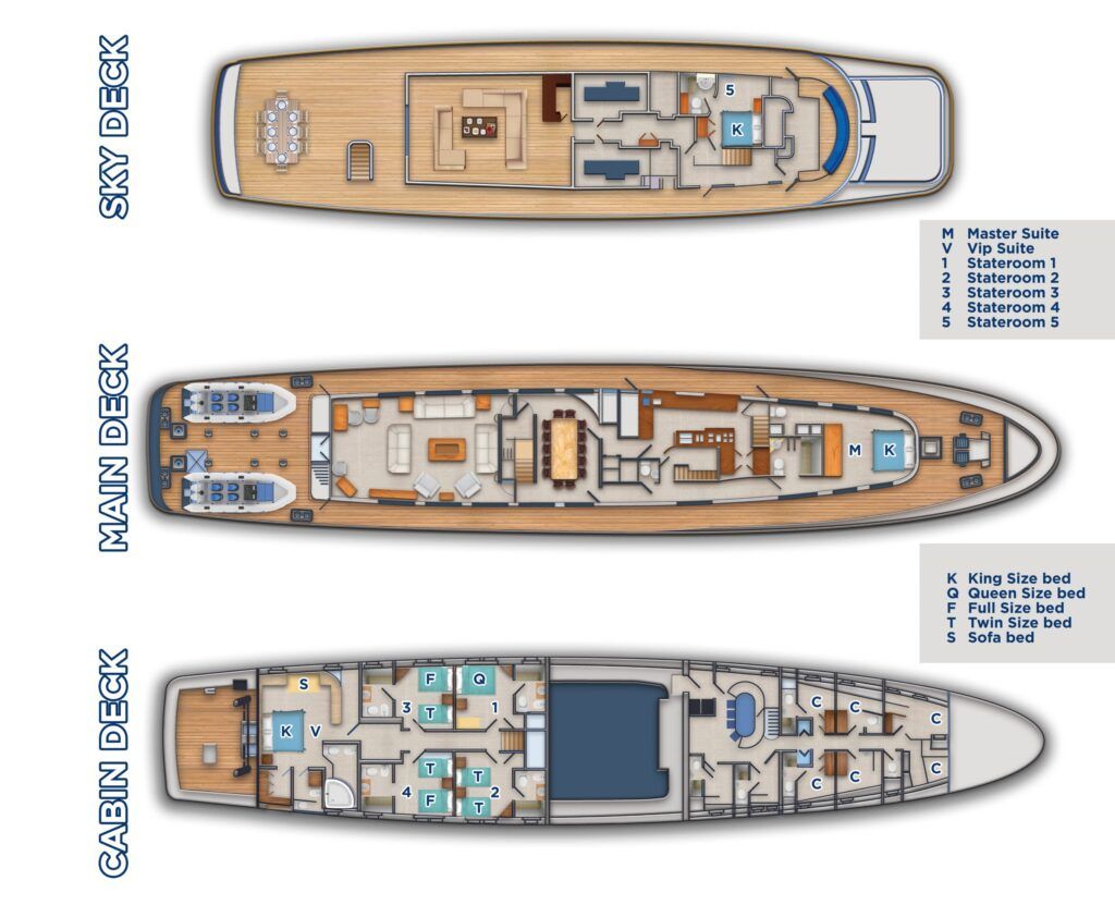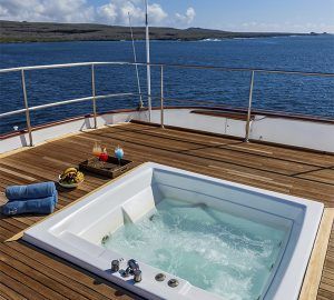 This elegant yacht features 5 beautifully appointed staterooms and 2 luxurious suites (complete with his-and-hers bathrooms). Enjoy gourmet cuisine served in a beautifully crafted dining room or al fresco on the panoramic sky deck. After a day of exploration, unwind on the expansive decks with secluded lounge chairs or relax in one of two soothing hot tubs.
