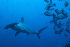 Дарвин является самым теплым местом для дайвинга на Галапагосских островах из-за тропического Панамского течения. Вы проводите большую часть погружения неподвижно, на платформе, которая падает в синеву, где акулы-молоты плывут против течения. Это похоже на то, как если бы вы стояли на обочине шоссе с акулами-молотами и наблюдали за проезжающим транспортом. Вы покидаете платформу, чтобы плыть в синеву, когда замечаете китовую акулу. Иногда это означает плавание через акул-молотов, поистине великолепный опыт, который вы запомните навсегда.
