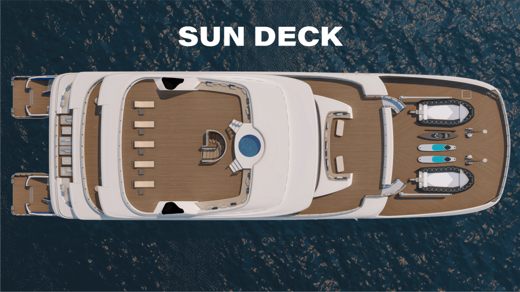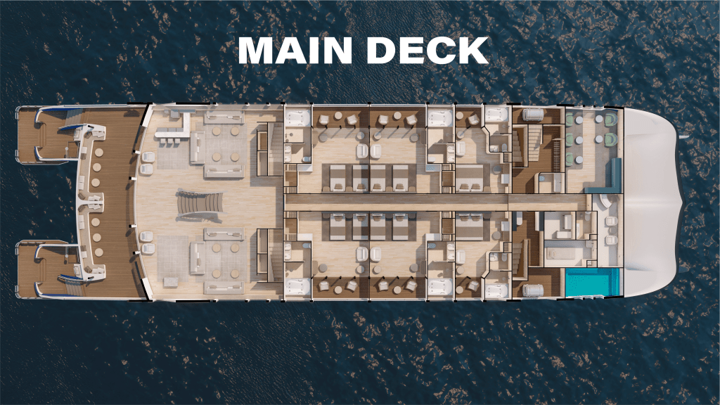 Главная палуба: 2 одноместных люкса. Верхняя палуба: 6 трансформируемых двухместных люксов. В люксах l2 есть собственный балкон, мини-бар, гардеробная и джакузи |