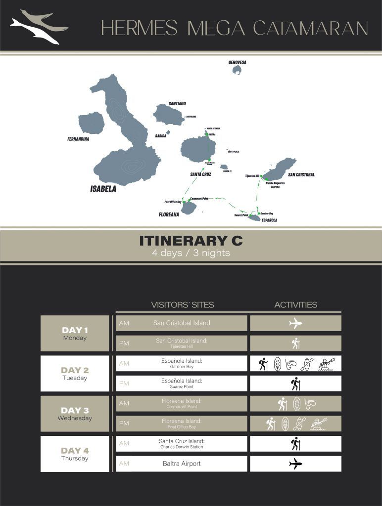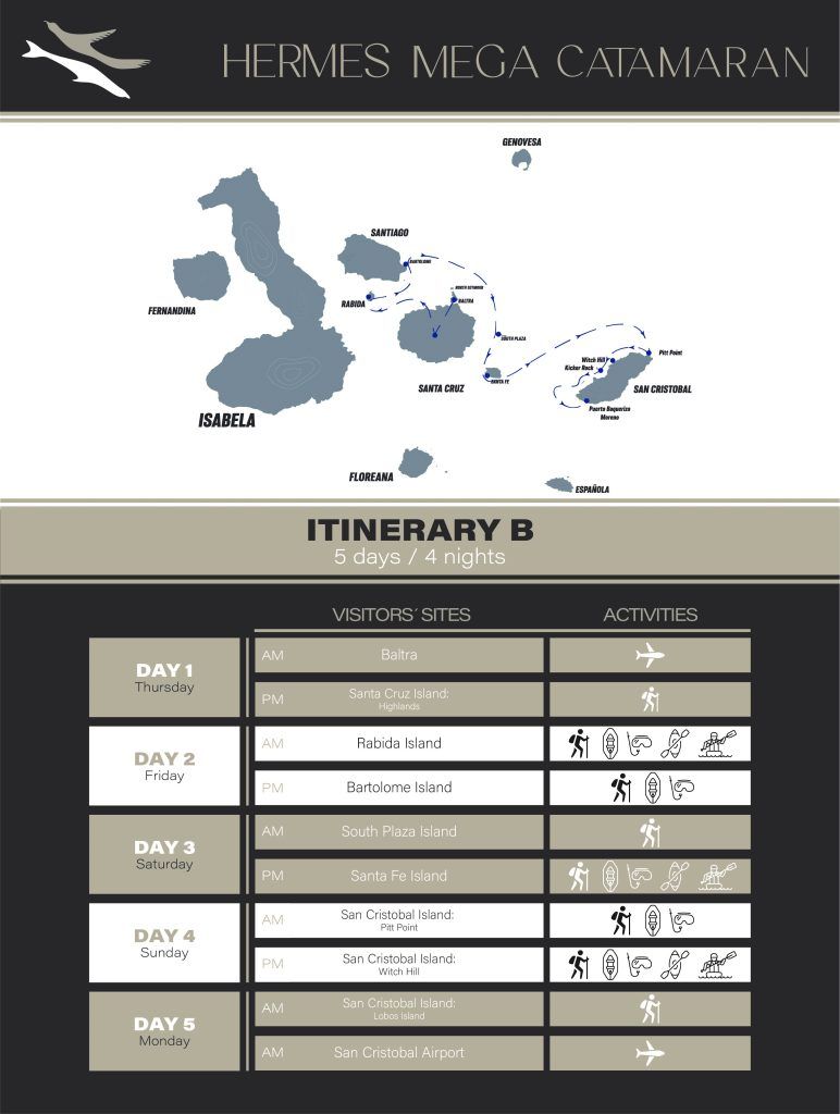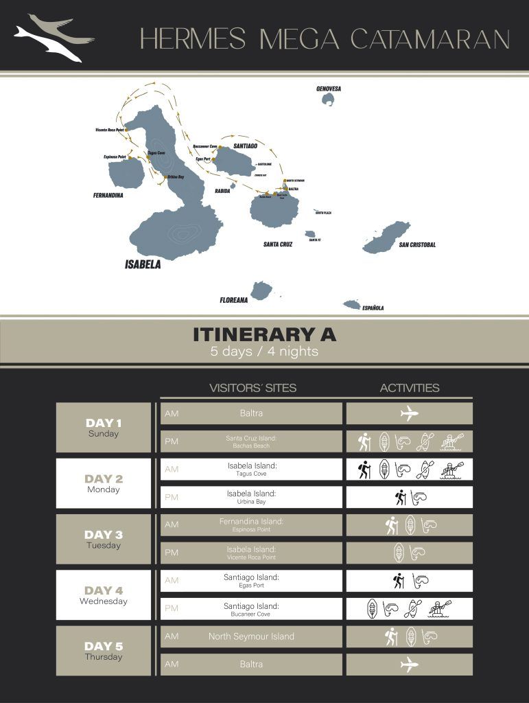 Мегакатамаран Hermes был специально разработан для исследования Галапагосских островов, предлагает вам тесную встречу с природой, и наши маршруты включают по крайней мере две лучшие достопримечательности архипелага на каждый маршрут. Таким образом, вы посетите самые отдаленные места на Зачарованных островах и понаблюдаете за различными видами животных.