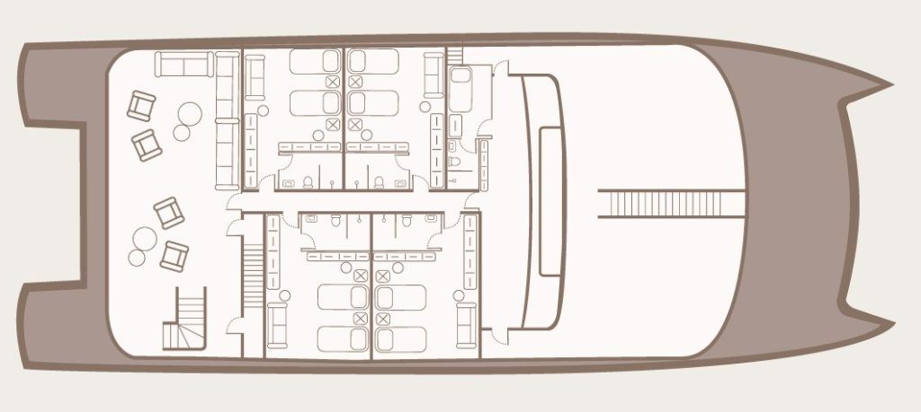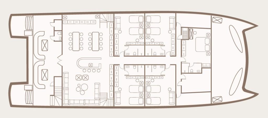 4 просторные каюты с панорамными окнами, из которых открывается вид на окружающие острова.